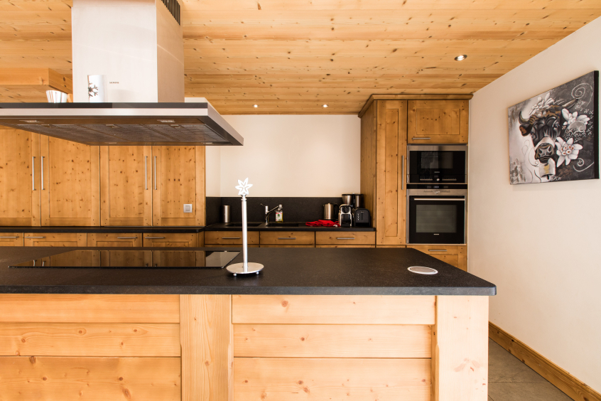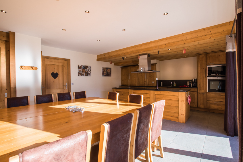 At garden level, there's a large lounge with picture windows overlooking a terrace facing the Espace Diamant ski slopes and a table that sits 14 people. A large fully-furnished and very functional kitchen.