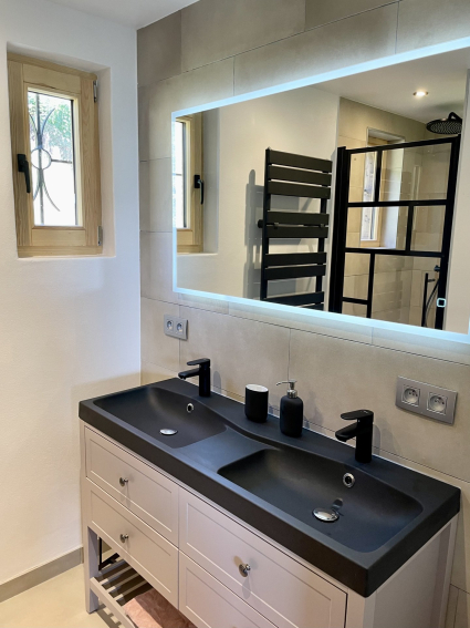 *ON THE FIRST LEVEL: Access to the first level from the stairs leading up from the garage, a dormitory bedroom with 2 bunk beds and a single bed (3*90) and access to the terrace, a double bedroom (160cm bed), a bathroom with bath and shower, separate toilet and a laundry area with washing machine.