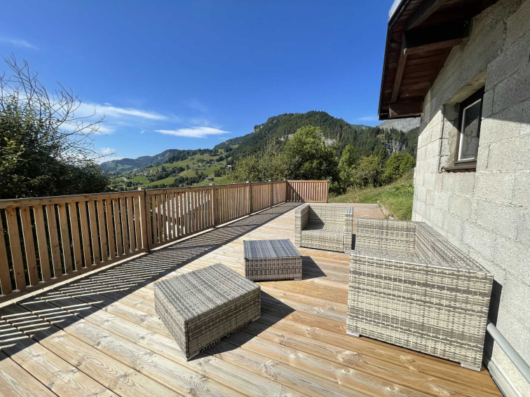 facing west, with a beautiful terrace. With its cosy atmosphere, this chalet is perfect for your next vacation, accommodating 8 to 10 people.