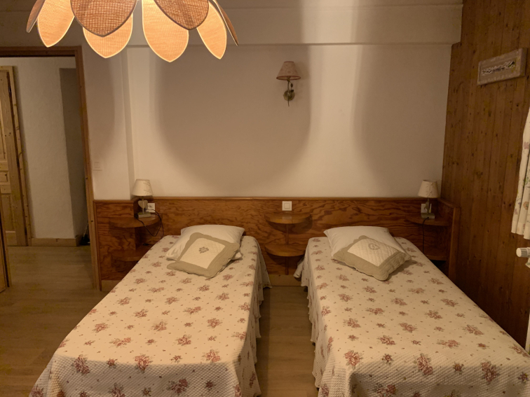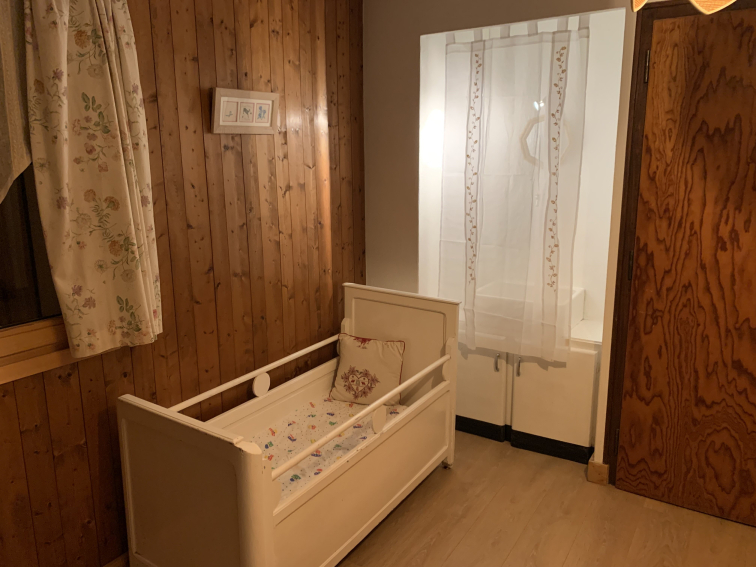 Une chambre avec 2 lits 90 cm + 1 petit lit de bébé en bois.