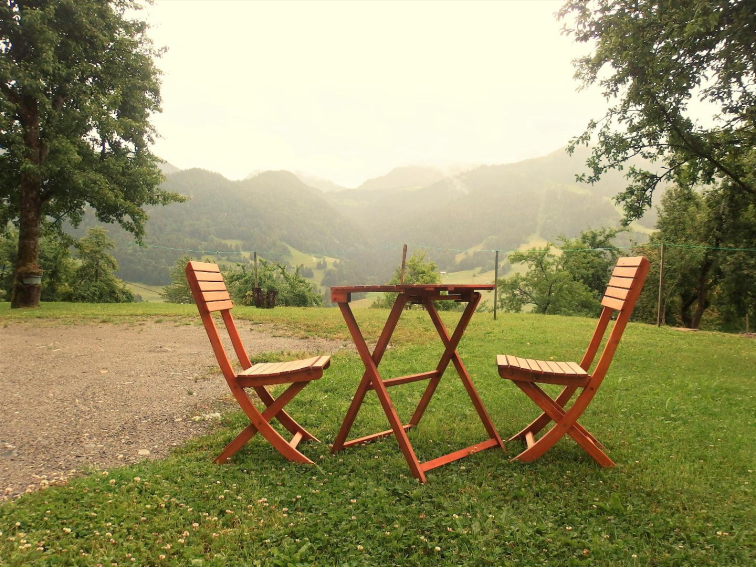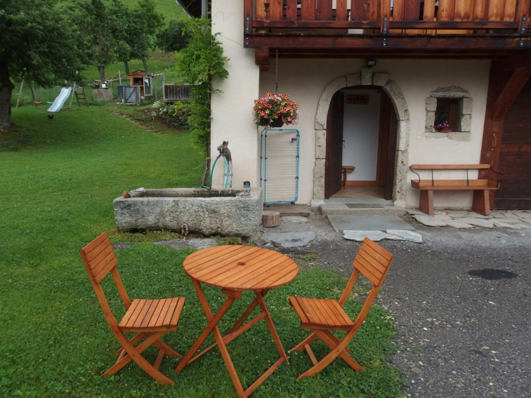 Beaucoup d'ombrage en été, avec table de jardin, sans danger pour les enfants, car pas de passage de route, très ensoleillé été comme hiver, très belle vue sur les montagnes