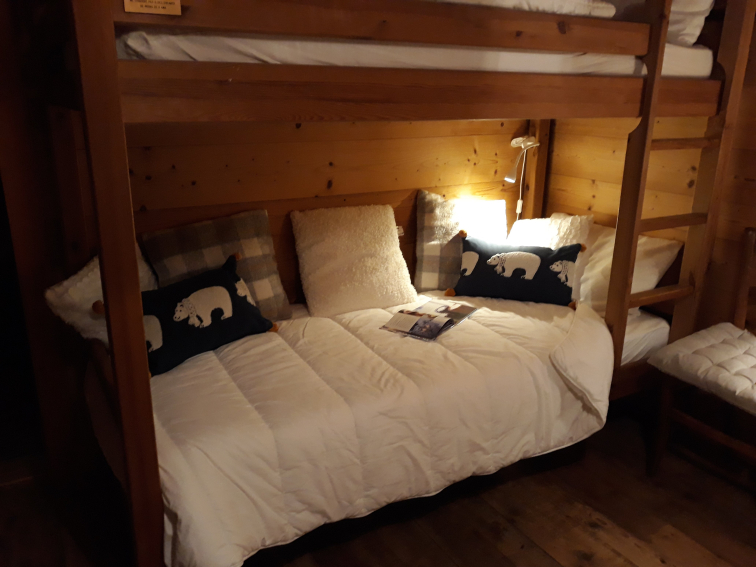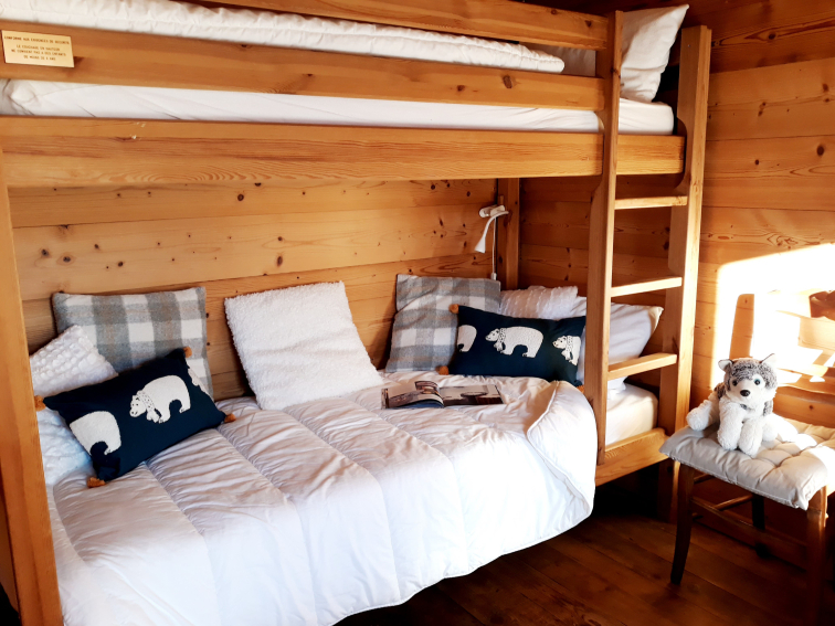 2 chambres (1 chambre avec lit double, 1 chambre avec lit double, 2 lits superposés et bureau), salon, cuisine ouverte, 1 salle de bain (colonne douche balnéo, 2 vasques)