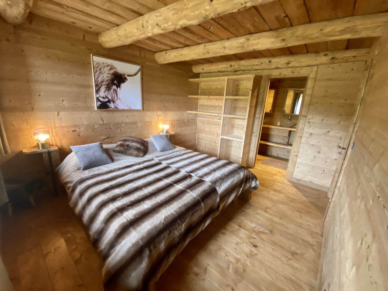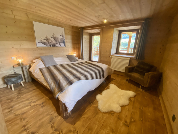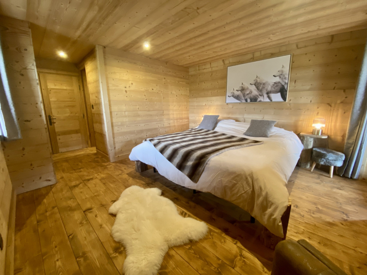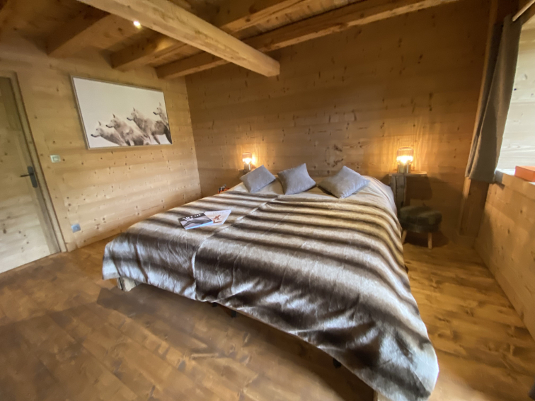 6 chambres spacieuses dont 1 chambre en mezzanine. Espaces de vie meublés dans l'esprit montagne -chic… poutres et boiseries anciennes, canapés, plaids en fourrure.