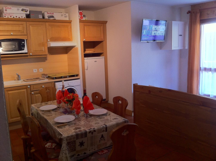Grand coin séjour avec coin repas et cuisine équipée de 4 plaques vitro céramiques, réfrigérateur, lave linge, four électrique combinémicro-onde, grille-pain, appareil à raclette, crêpes-partie, cafetière électrique classique, bouilloire, appareil à fondue, gril viande électrique pour l'extérieur.