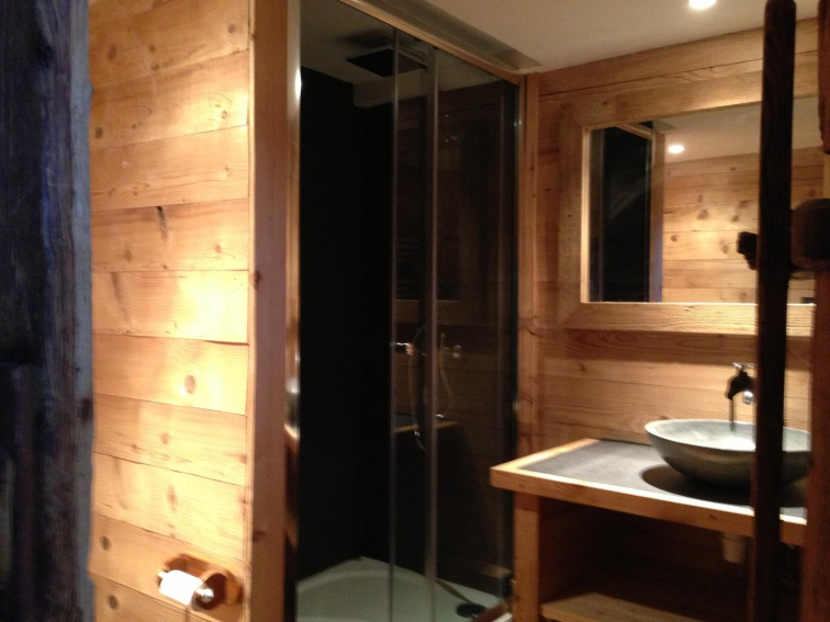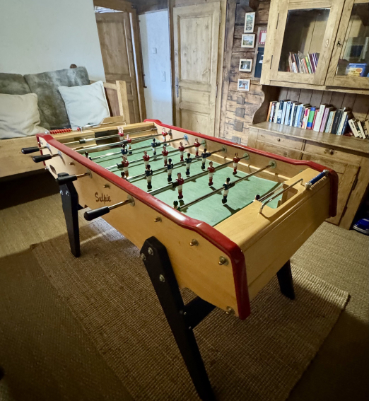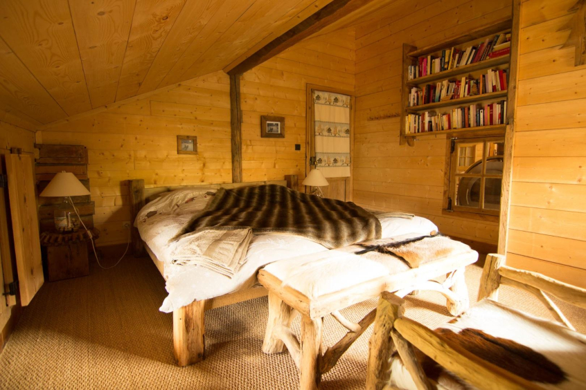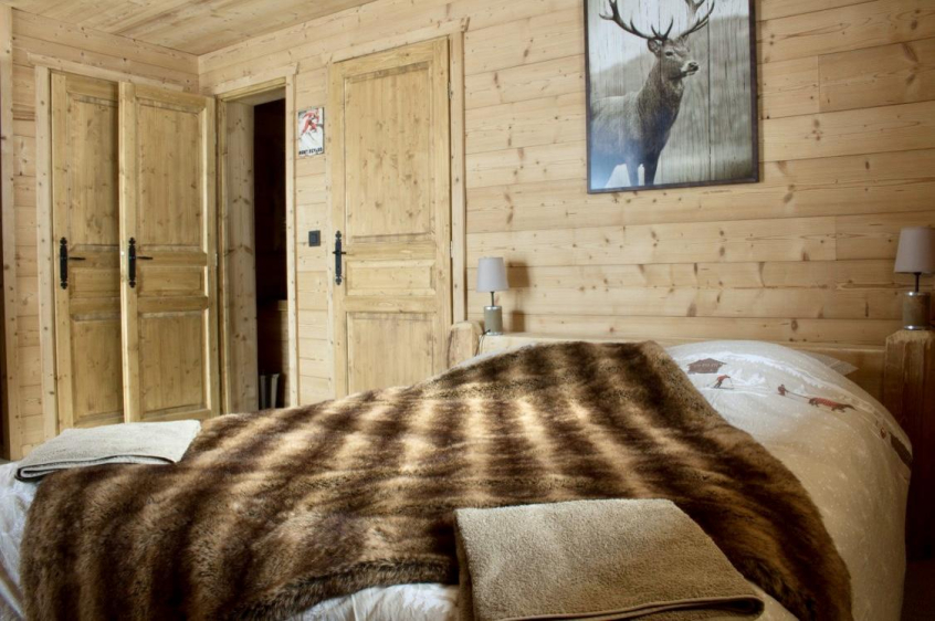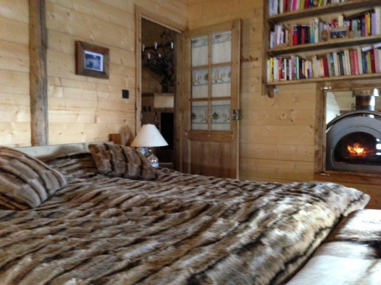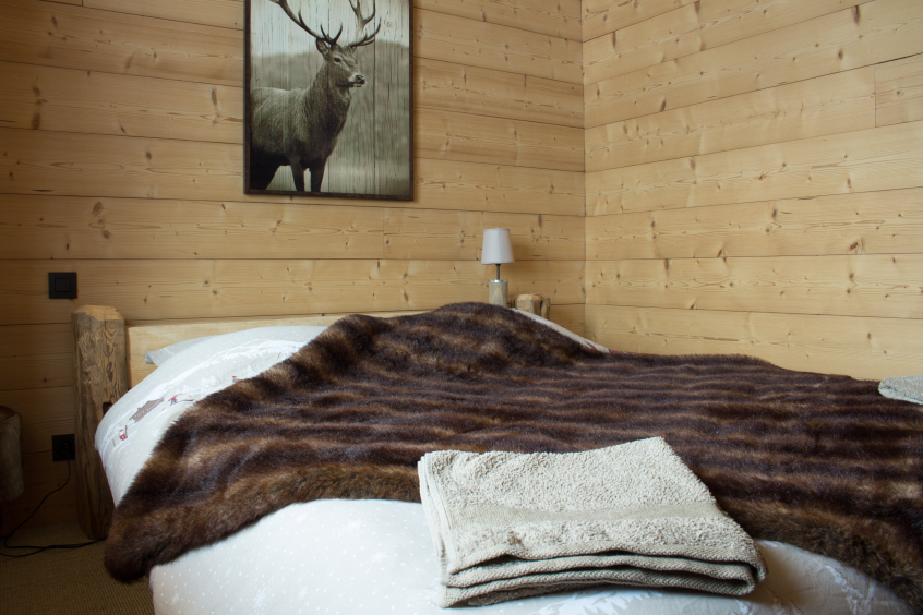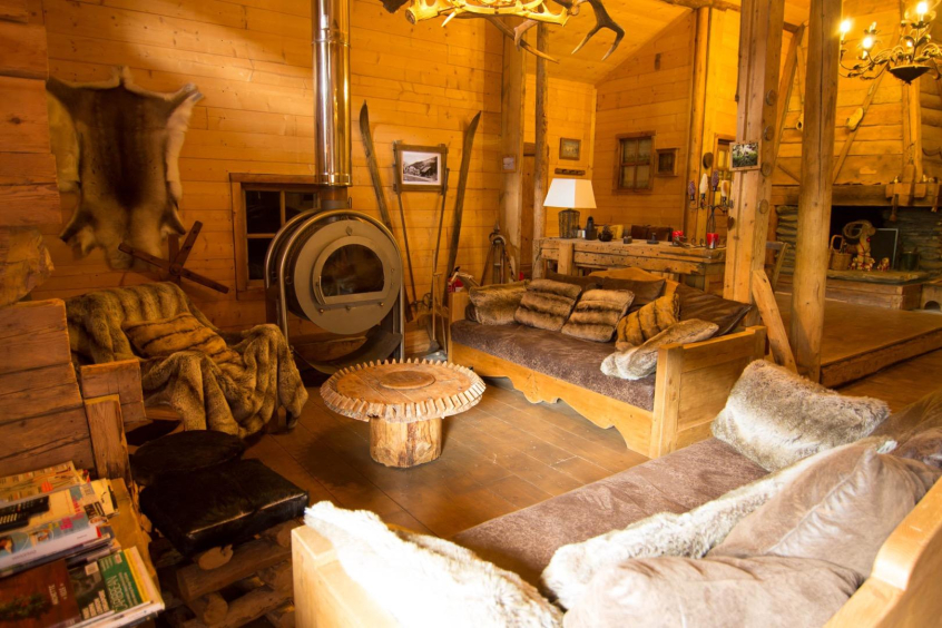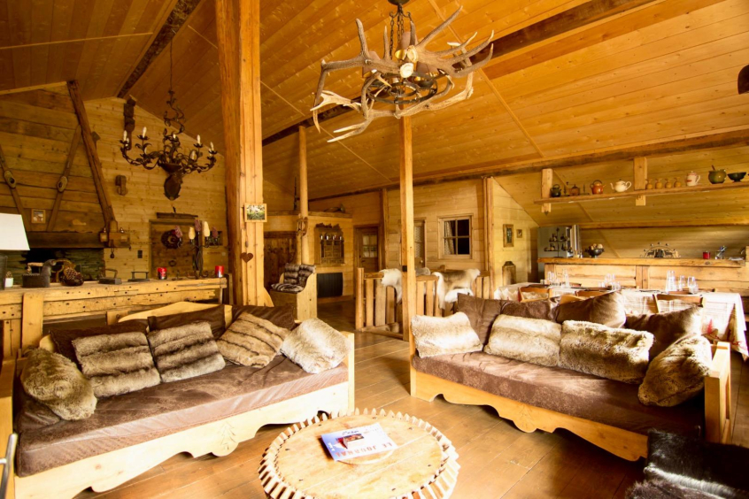 Meublé dans l'esprit montagnard, poutres et boiseries anciennes, canapés, plaids en fourrure. Ambiance cosy et chaleureuse.
