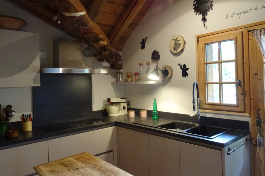 Cuisine aménagée, réfrigérateur, plaque à induction, four, four à micro ondes, lave vaisselle, cafetière, machine Nespresso, grille pain, appareil à raclette, à fondue.