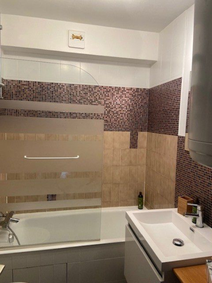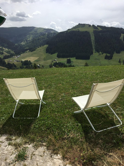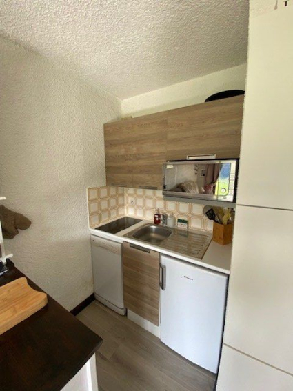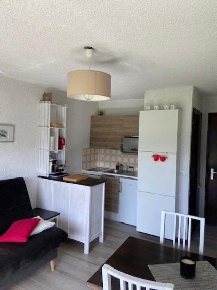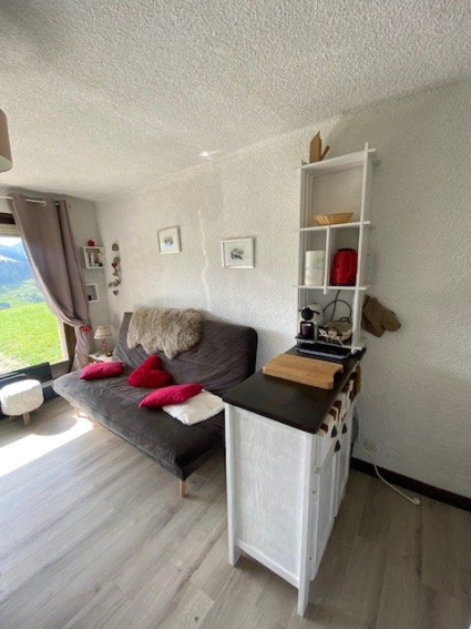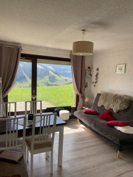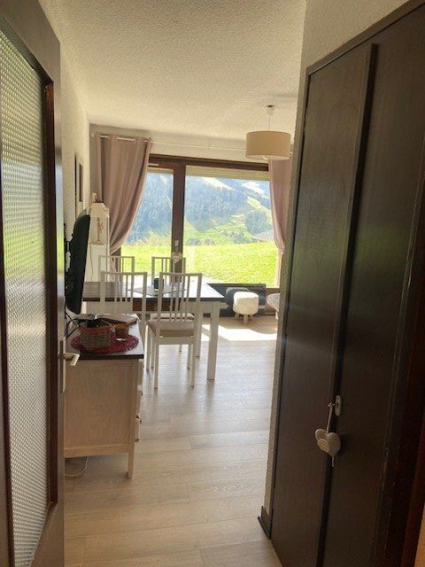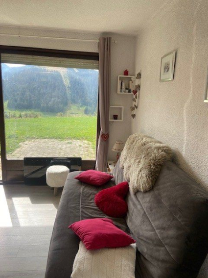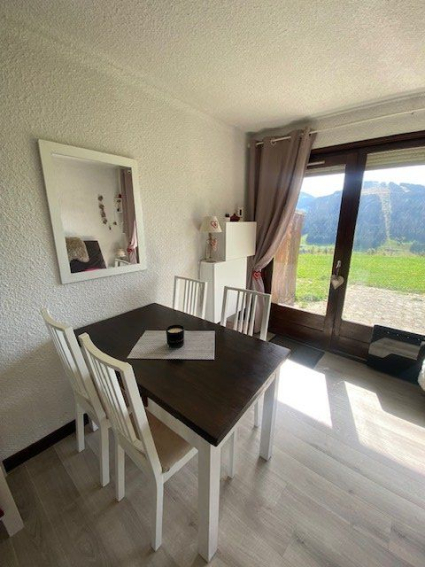 Studio cabine en Rez de Jardin, 25 m², avec une terrasse orientée plein sud, panorama exceptionnel face au Montrond. (Terrain de tennis en été - Pied des pistes en hiver), entièrement rénové.