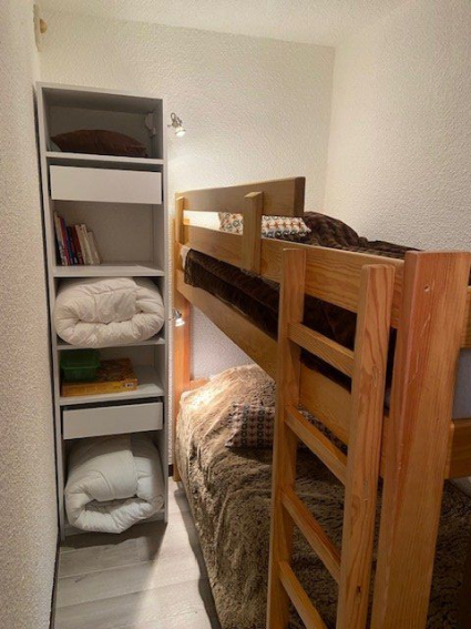 Un coin montagne fermé avec 2 lits superposés, chevets et rangements.