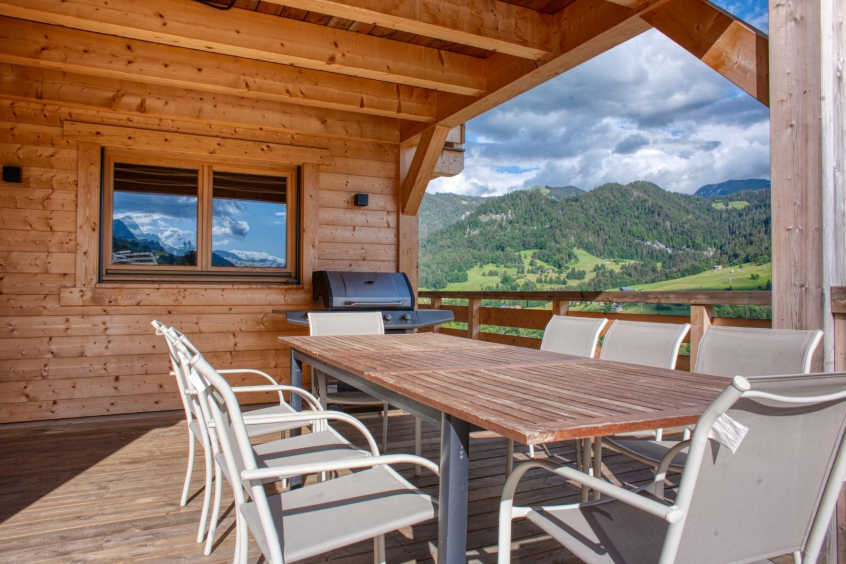 A l étage, cuisine tout équipée ouverte sur séjour spacieux et confortable, et salle a manger. Accès a la terrasse abritée du chalet par de grandes baies vitrées, lumineuses. Exposition plein sud, vue imprenable sur Mont Blanc, Aiguille du Midi et domaine skiable de Praz Sur Arly. Une chambre avec lit double et salle de bain privative (douche + WC) occupe également le 1er étage.
