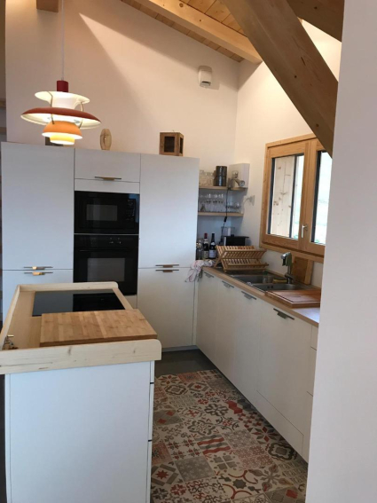 Au niveau principal : une grande pièce à vivre avec cuisine ouverte toute équipée, beaucoup de matériels pour cuisiner, salon-salle à manger prolongé par une grande terrasse, un WC indépendant avec fenêtre, belle charpente bois visible, grande hauteur sous plafond.