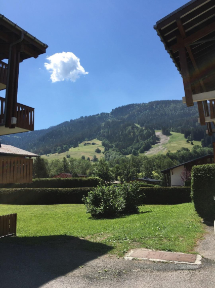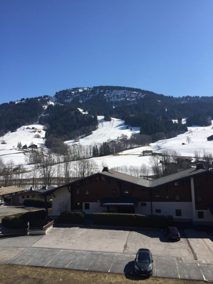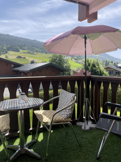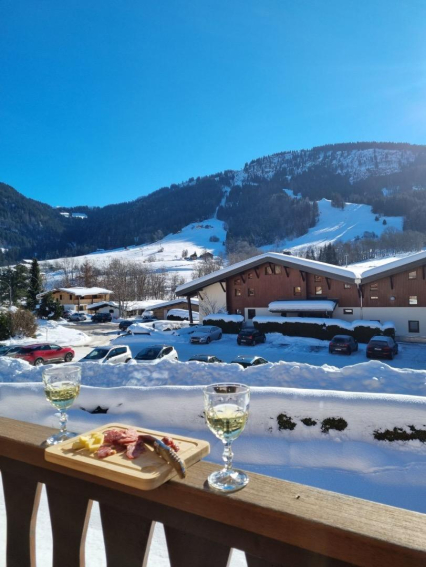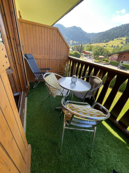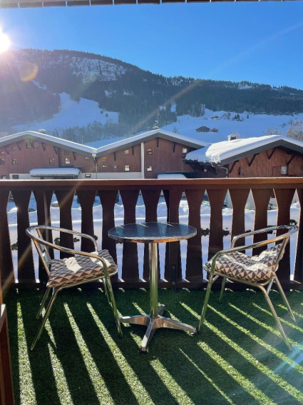 Le petit balcon dispose d’un table et de chaises. Il est très agréable car il est orienté plein Sud avec vue sur les pistes de ski.