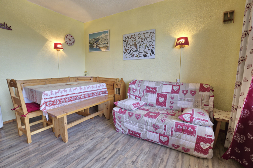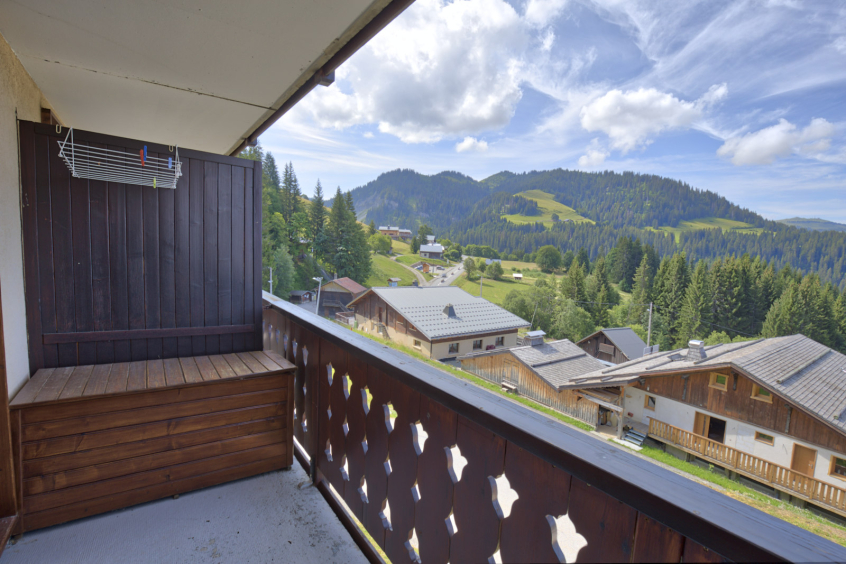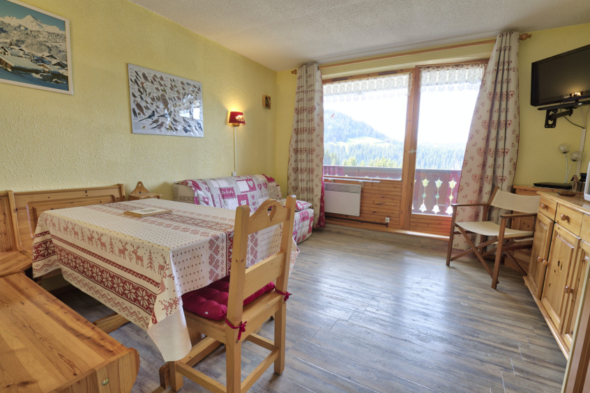 Studio cabine pour deux à quatre personnes à 1450m d'altitude, à côté du téléski de La Boulangère. D'une surface de 26 m², il est situé au premier étage avec un balcon sud qui offre une belle vue sur le Mont Charvin et la vallée.