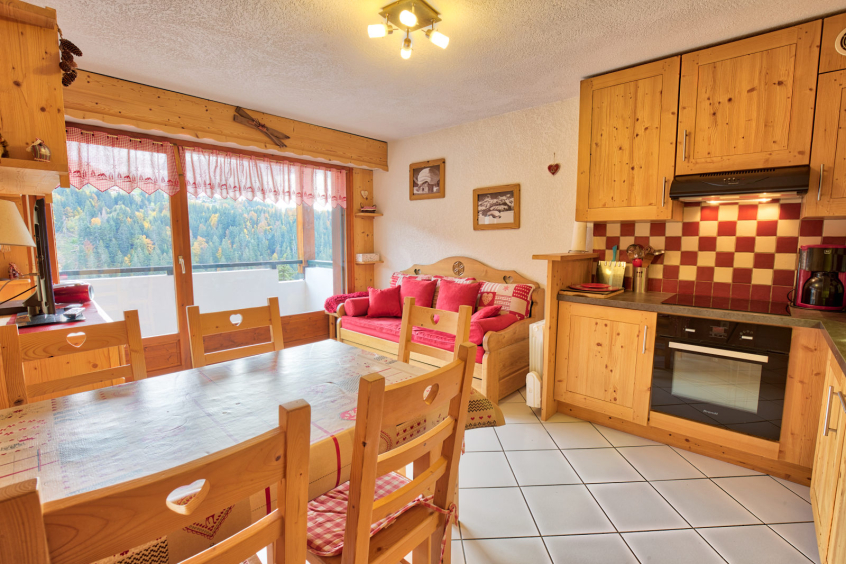 Appartement de 42m², 3 pièces pour 6/8 personnes. Situé au 1er étage, il bénéficie d'un balcon SUD avec vue sur le Mont Charvin et la vallée.