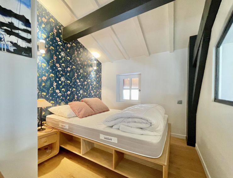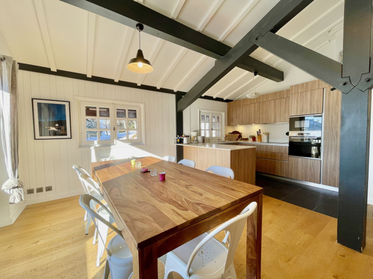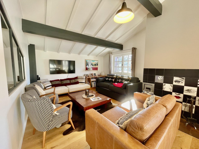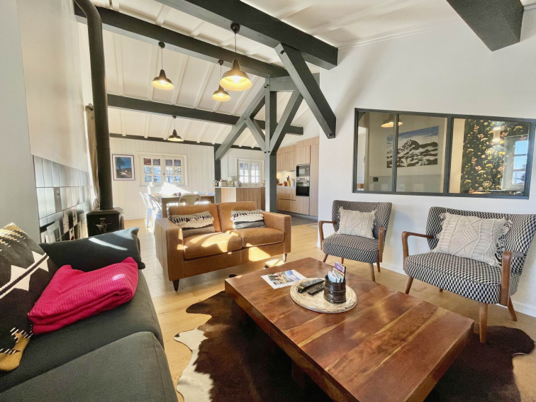 - grande pièce à vivre avec cuisine toute équipée (plaques induction : quatre feux, four, micro-ondes, lave-vaisselle, réfrigérateur), poêle à bois, canapé convertible deux places (140), télévision écran plat,