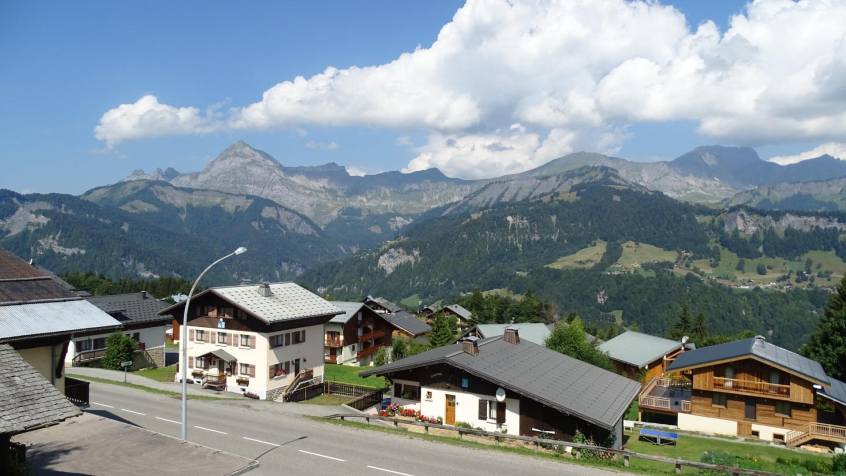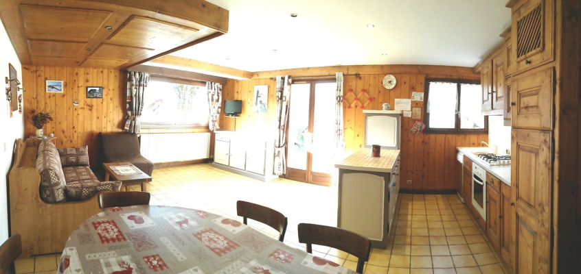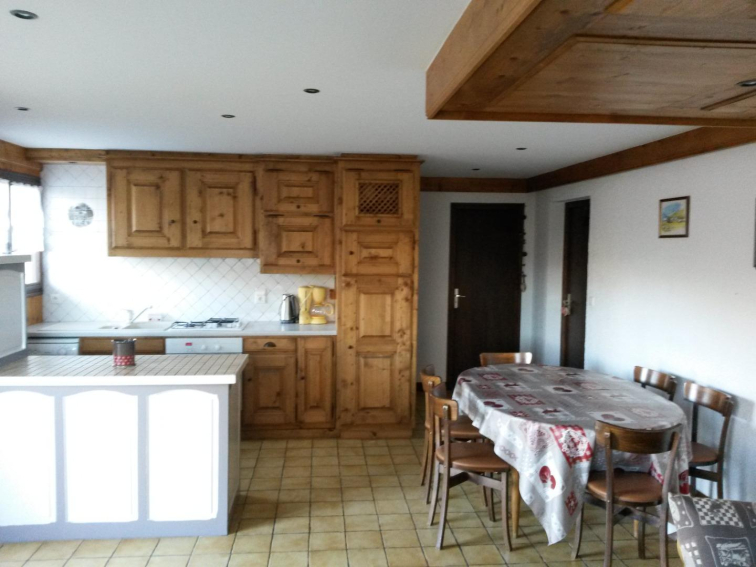 Appartement au rez-de-chaussée, avec vue sur la chaîne des Aravis et le Mont-Charvin, comprenant une cuisine toute équipée avec four, micro-onde, frigo partie congélation, cuisinière, lave-vaisselle, appareil à raclette.