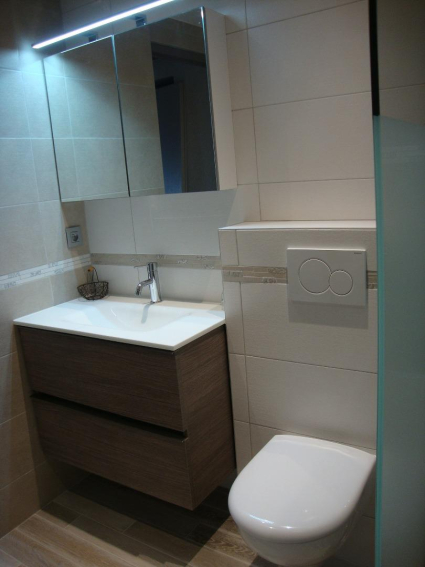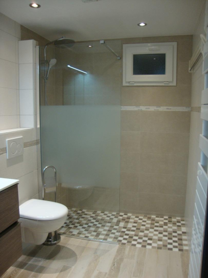 Une salle d'eau, avec douche à l'italienne, un meuble vasque et un wc.