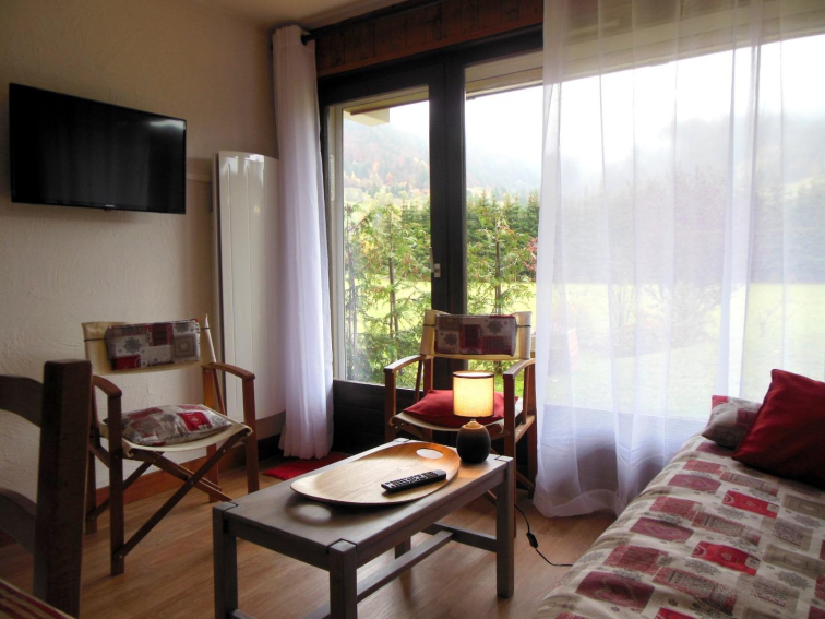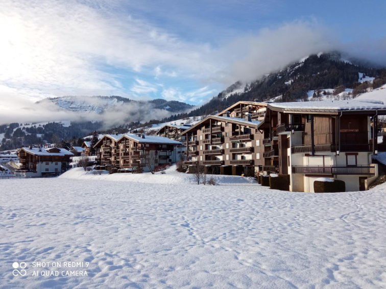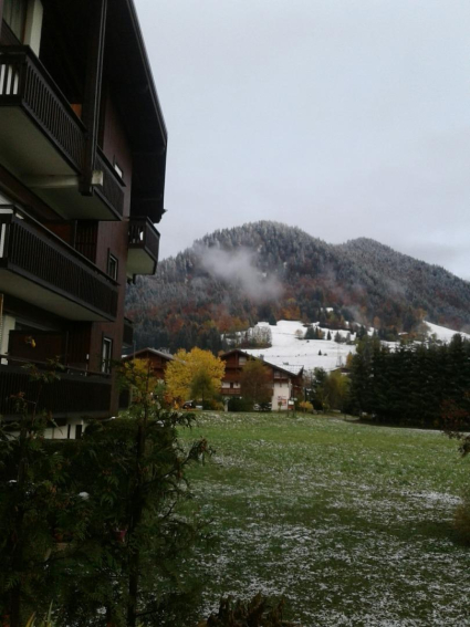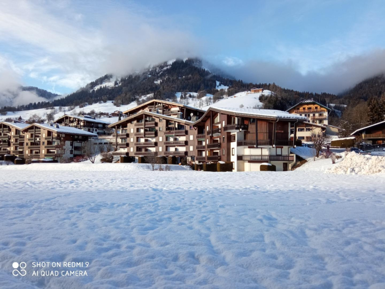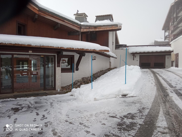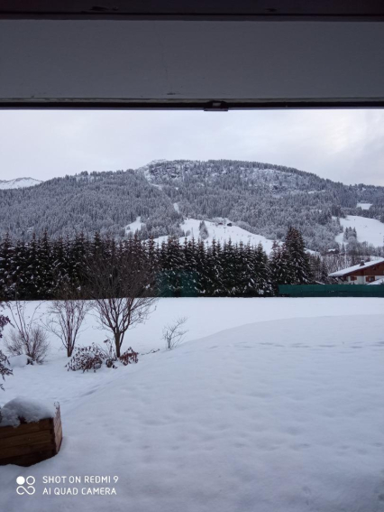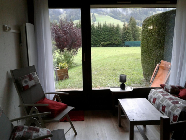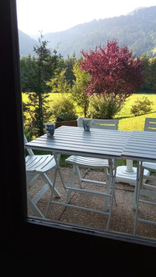 Terrasse privative exposée plein Sud donnant sur jardin (mobilier de jardin ) . Vue dégagée sur les pistes!