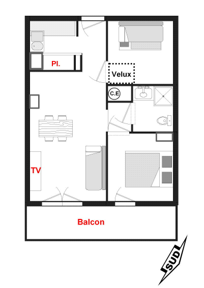 - Couchages : une chambre avec un lit double (140), une chambre avec un canapé-lit une place et un lit-tiroir une place (lit gigogne - 2x90), séjour avec un canapé-lit deux places (160).