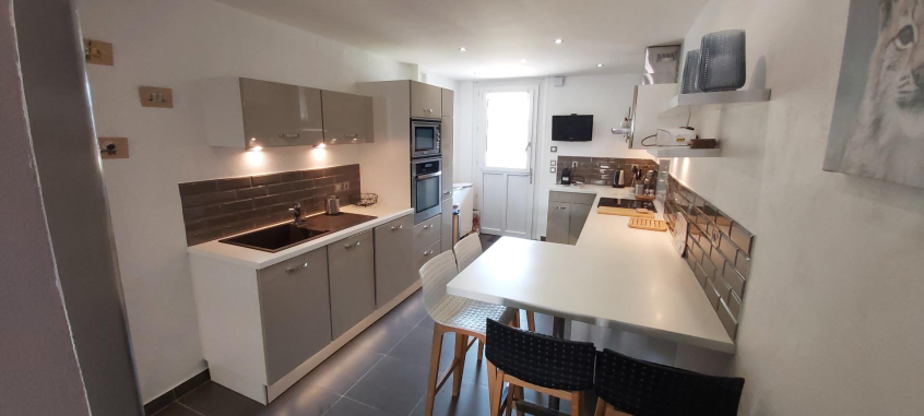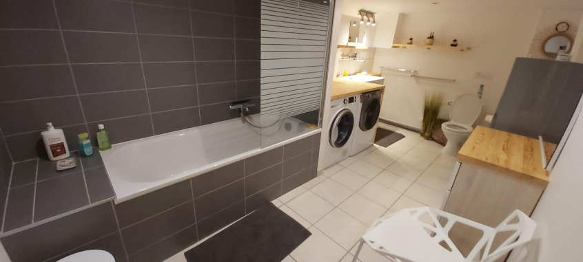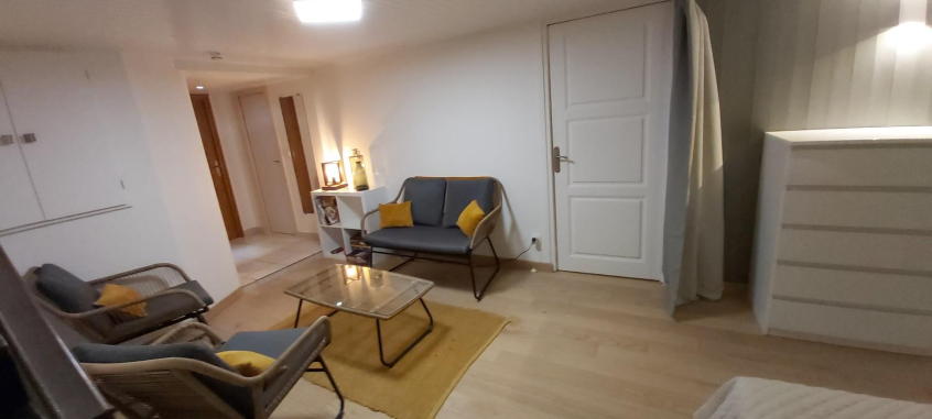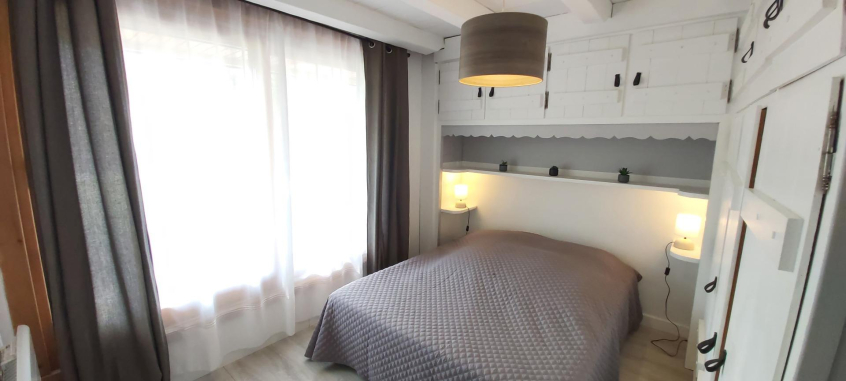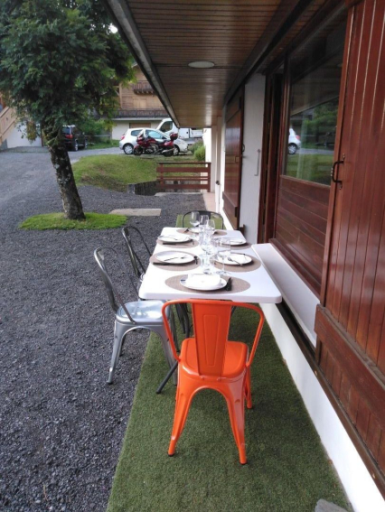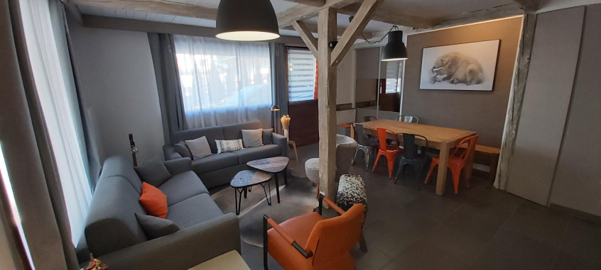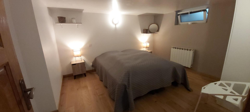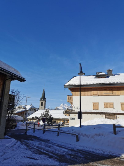 Bel appartement de 120m2 en RCH et -1, avec vue sur l'Aiguille du Midi à l'Est et sur le clocher de l'église à l'Ouest, coin terrasse, casier à ski, 3 chambres, 1 coin lit 140x200, 1 canapé convertible, 2 salles d'eau avec WC. Situé en centre ville à 20m de la boulangerie et du Sherpa, 30m de la navette et 800m des pistes. 2 places de stationnement extérieur de part et d'autre de l'appartement.