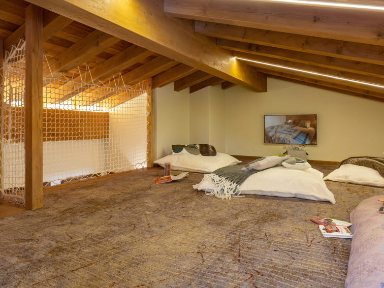 Il a été aménagé spécialement pour les familles, avec deux espaces de jeux / télévision pour les jeunes vacanciers, ainsi qu’une grande pièce de vie très lumineuse, qui inclut une cuisine équipée, un espace salle à manger avec cheminée, et un confortable salon. Des portes-fenêtres mènent de cette pièce au balcon.