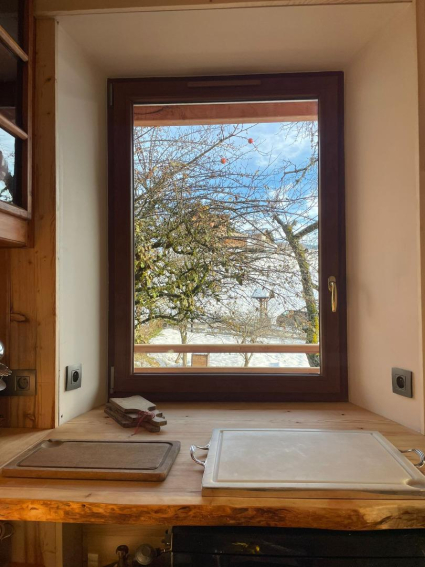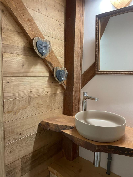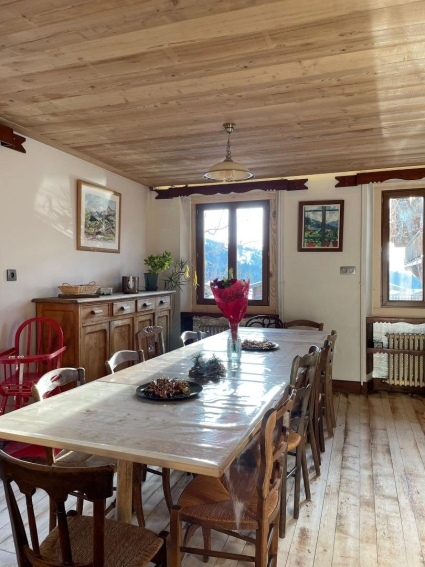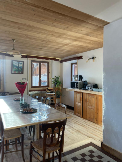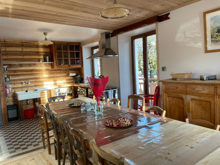 Dans la cuisine à l'ancienne ouverte sur la salle à manger, comme dans la tradition montagnarde, les convives se retrouveront autour de la grande table de la maison pour des moments chaleureux tout en ayant chacun sa chambre pour des moments de retour au calme.