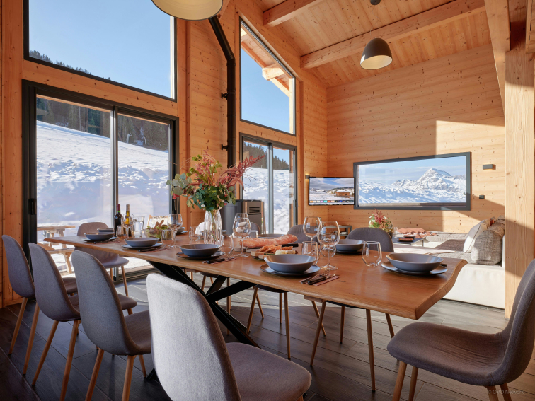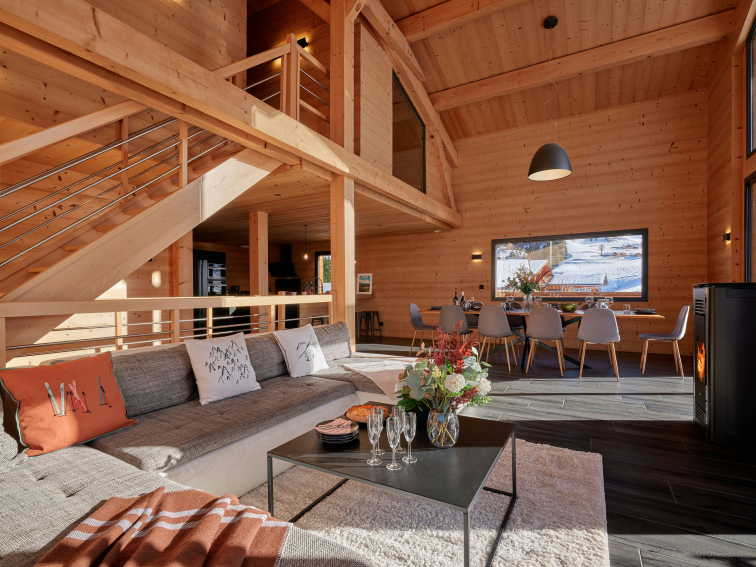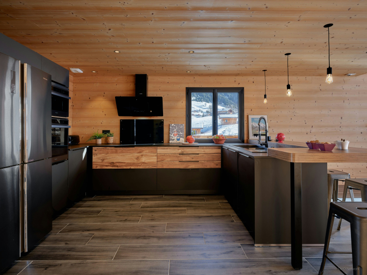 La vaste pièce de vie ouverte au rez-de-chaussée est particulièrement lumineuse, grâce à des portes-fenêtres et de grandes baies vitrées. Elle inclut un coin salon, avec canapé, télévision et poêle à bois, et une cuisine moderne. Grâce à son double four et son grand réfrigérateur, vous aurez plaisir à préparer vos repas, puis à les savourer tous ensemble autour de la grande table à manger. Par beau temps, la vaste terrasse adjacente propose une table extérieure et un barbecue, ainsi qu’un balcon panoramique entourant le chalet.
