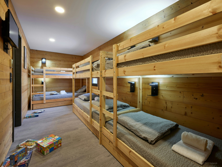 Le rez-de-jardin comprend un garage, un local à skis avec sèche-chaussures chauffant, et une salle de détente avec une télévision et un babyfoot. Six personnes peuvent prendre place dans un dortoir avec lits superposés, et bénéficier d’une salle de douche avec des toilettes séparées.