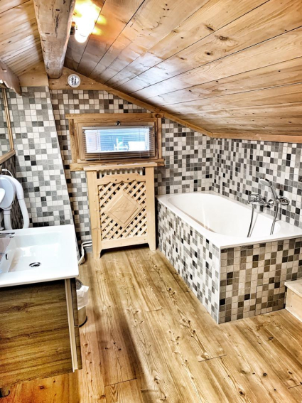 Vous disposez d'une grande pièce à vivre très agréable , ambiance bois, cosy et confortable.